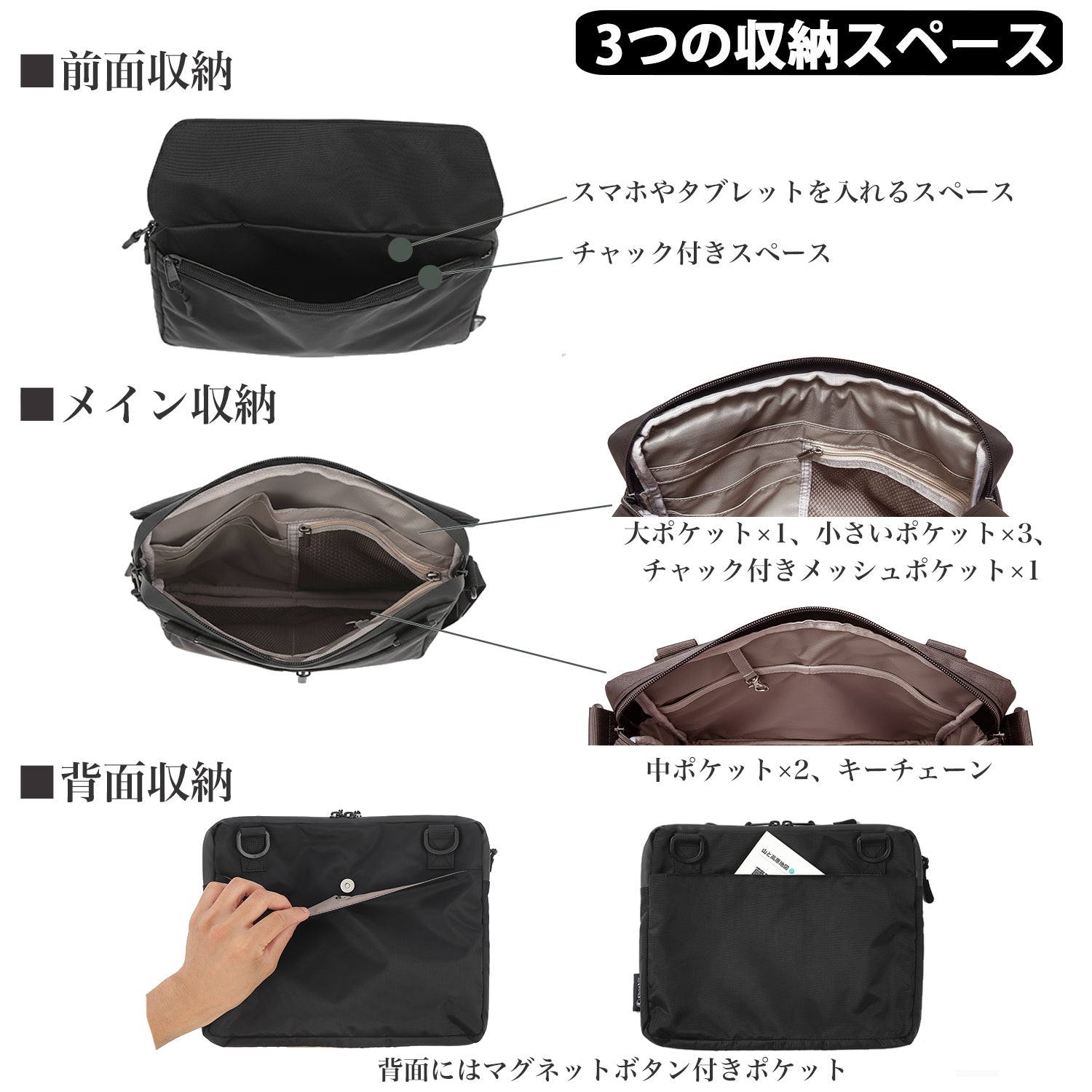 ・便利な背面ポケット:旅行中の地図やハンカチをサッと取り出せるマグネットボタン付きポケットを背面に配置しました。