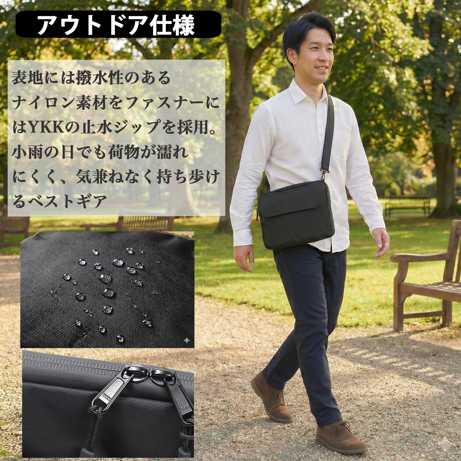 3. 信頼の「撥水素材 & YKK止水ジップ」を採用