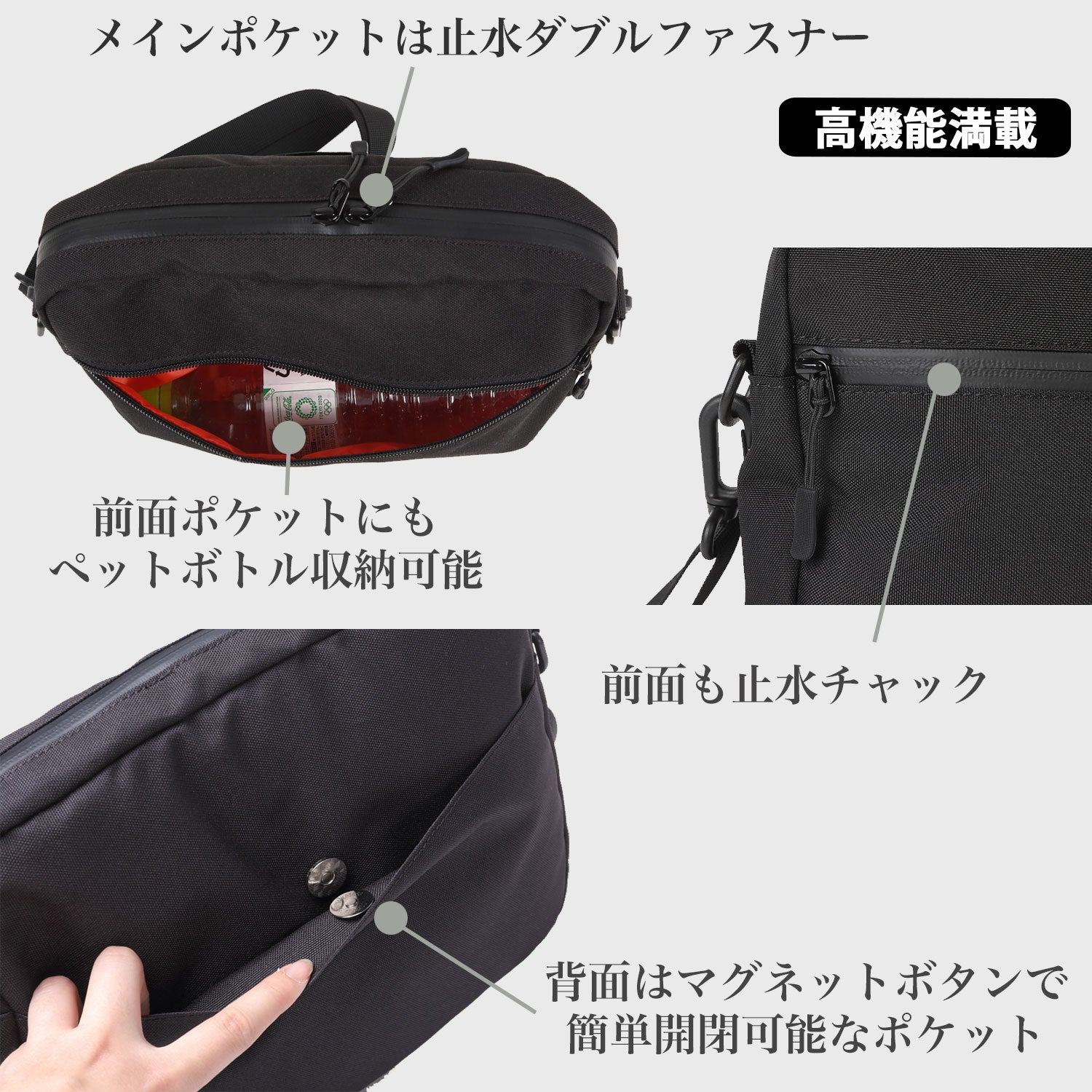防水性、収納(3ポケット)、軽量、タブレット保護機能を備えたミニショルダーバッグ。普段使いから、軽量なのでトレッキングのサコッシュとしてもお使い頂けます。