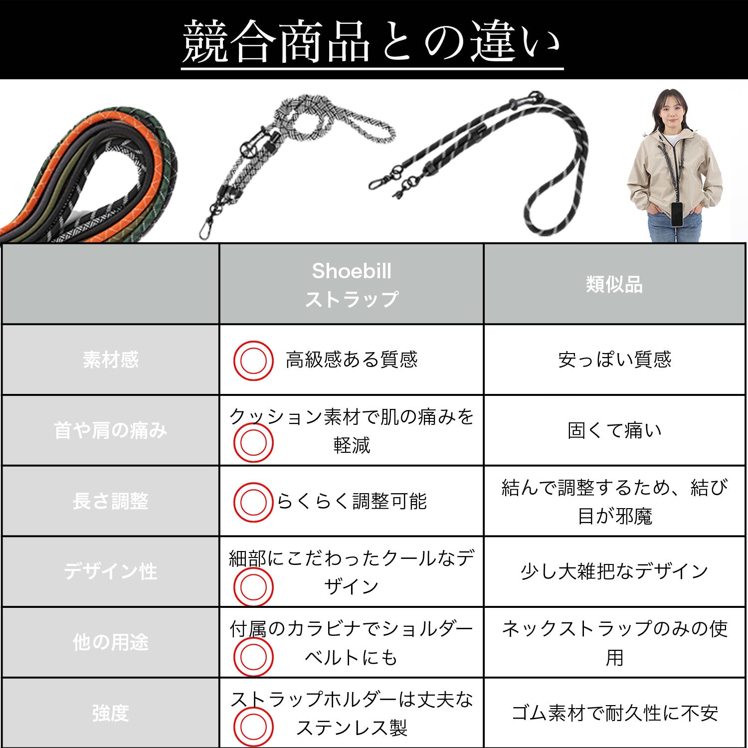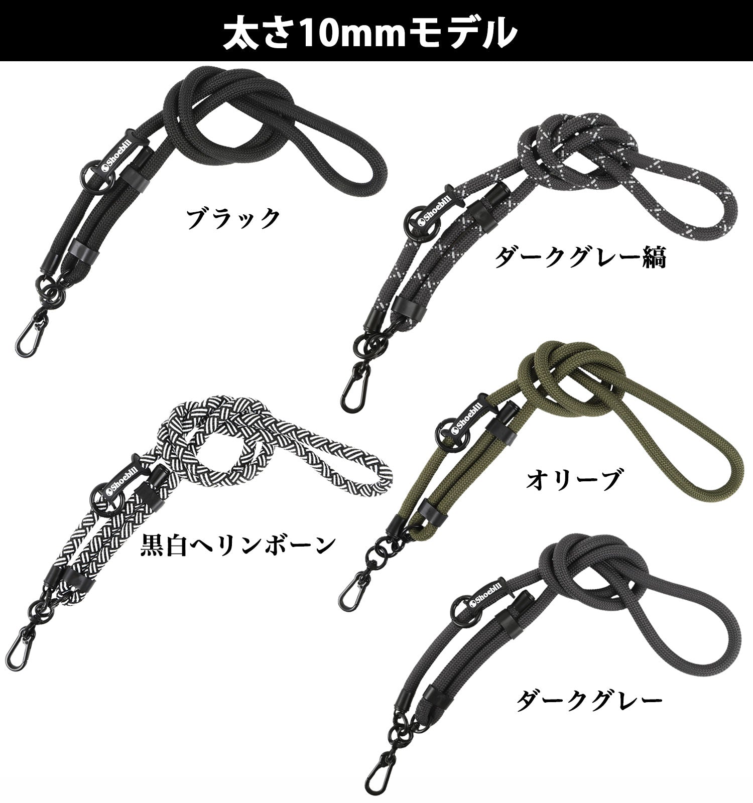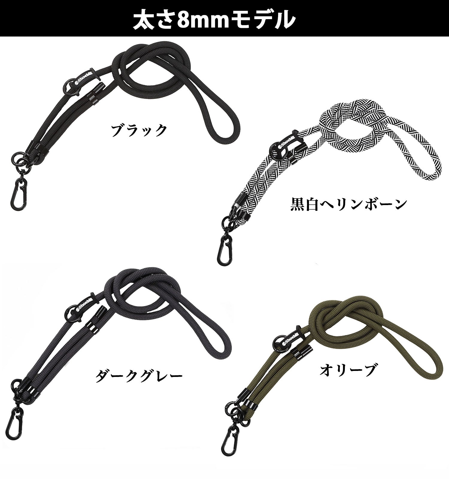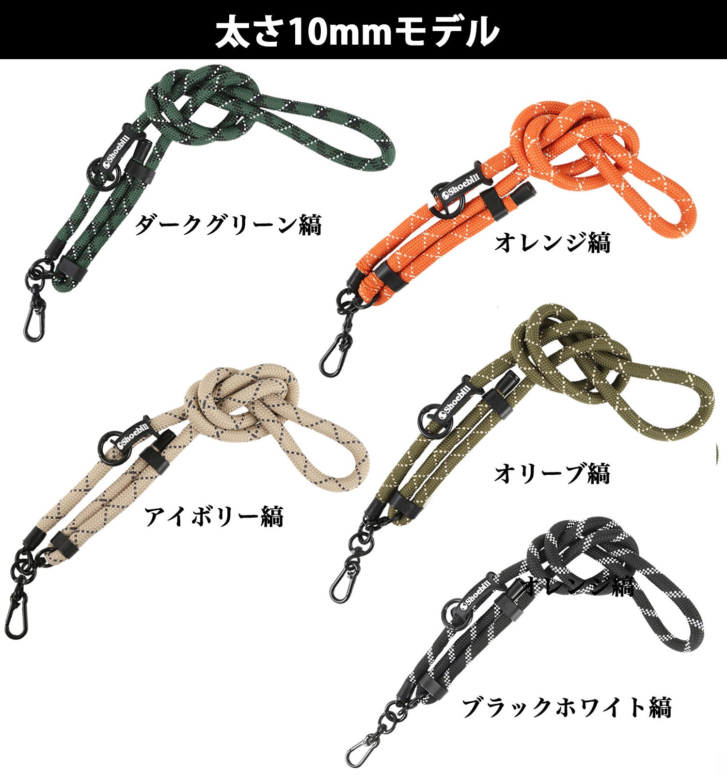 アウトドアで使用するロープを使った耐久性、ファッション性を避けたストラップ。クッション性で首・肩の痛みを防ぎます。調整機能も備えているので男女、年齢を問わずお使いいただけます。付属のストラップホルダーでスマホに簡単装着OK。また、もう一つカラビナが付属するので、バッグやポーチにつけて、ショルダーベルトとしてもお使いいただけます。