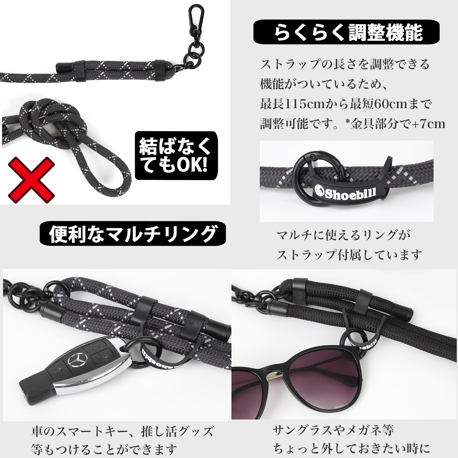 【便利なリング】:マルチに使えるリングがストラップに付属。サングラスやメガネをちょっと外したい時に付けることができます。推し活グッズを付けるのも可能です。 【ショルダーベルトにも】カラビナがもう一つ付属しているので、それを付ければ、ショルダーベルトとしてバッグやポーチにも付けることができます。 アウトドアでも さらに差をつけるファッションが可能です。
